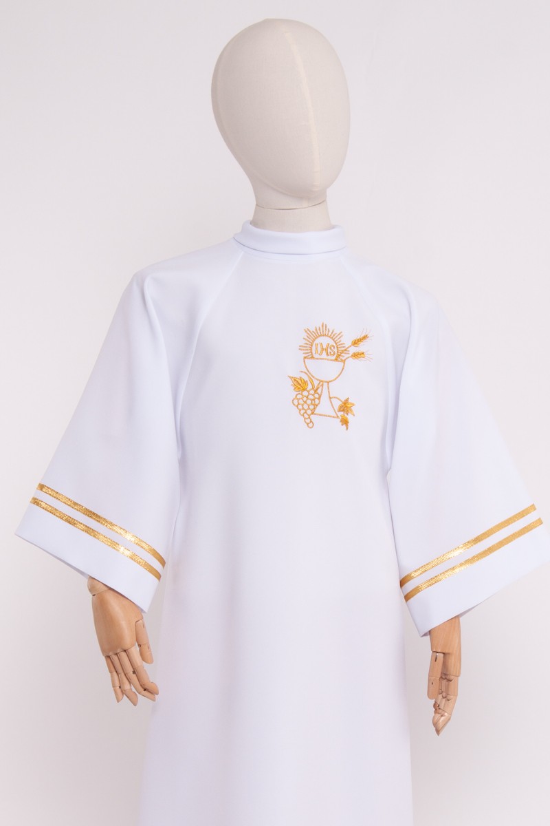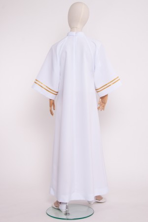 Eine schöne weiß Albe für Chöre. Die vorgestellte Albe hat einen Stehkragen in Form eines Golfkragens und weite 5/6 Ärmeln, die mit einem goldband. Das Kleidungsstück wird mit einem Reißverschluss.