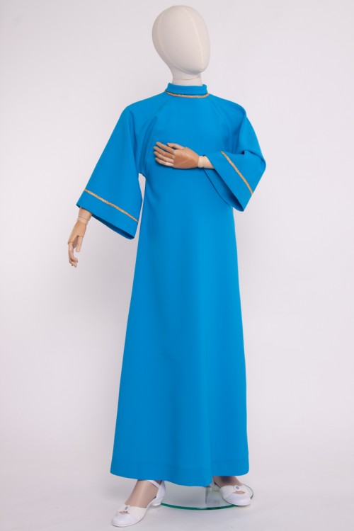 Eine schöne cyanblau Albe für Chöre. Die vorgestellte Albe hat einen Stehkragen in Form eines Golfkragens und weite 5/6 Ärmeln, die mit einem goldband. Das Kleidungsstück wird mit einem Reißverschluss.