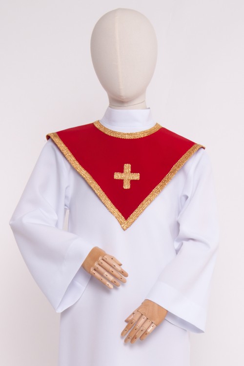 Die klassische Form des dreieckigen Kragens dieses Modells ist eine interessante Variation für Ministranten, Lektoren, Chor oder Kirchengruppenkleidung. Bei dem hier vorgestellten Modell handelt es sich um einen separat angebrachten Kragen in der Form eines Dreiecks, der schön mit einem Goldband verarbeitet wurde. Ohne Verschluss.
