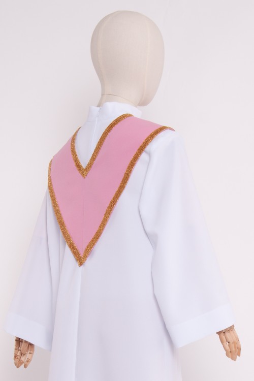Die klassische Form des dreieckigen Kragens dieses Modells ist eine interessante Variation für Ministranten, Lektoren, Chor oder Kirchengruppenkleidung. Bei dem hier vorgestellten Modell handelt es sich um einen separat angebrachten Kragen in der Form eines Dreiecks, der schön mit einem Goldband verarbeitet wurde. Ohne Verschluss.