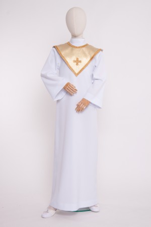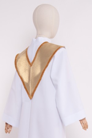 Die klassische Form des dreieckigen Kragens dieses Modells ist eine interessante Variation für Ministranten, Lektoren, Chor oder Kirchengruppenkleidung. Bei dem hier vorgestellten Modell handelt es sich um einen separat angebrachten Kragen in der Form eines Dreiecks, der schön mit einem Goldband verarbeitet wurde. Ohne Verschluss.