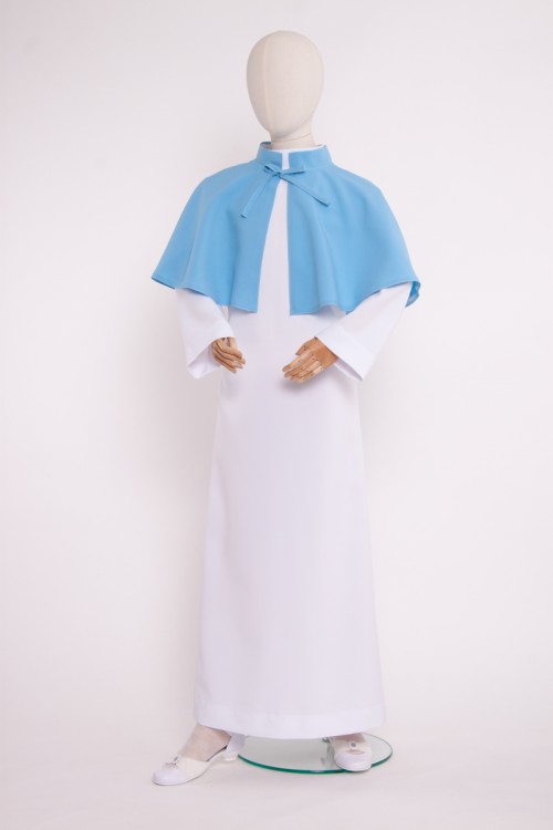 Eine schöne, kurze Pelerine für einen engagierten Chor. Der Stehkragen, der bis zur Hälfte der Schultern reicht, ist in drei Längen erhältlich - 20cm, 30cm und 50cm, wodurch Sie das Gewand an die Körpergröße jedes einzelnen Chormitgliedes anpassen können. Die kurze Pelerine wird aus polyester gefertigt und wird mit Schnüren gebunden.