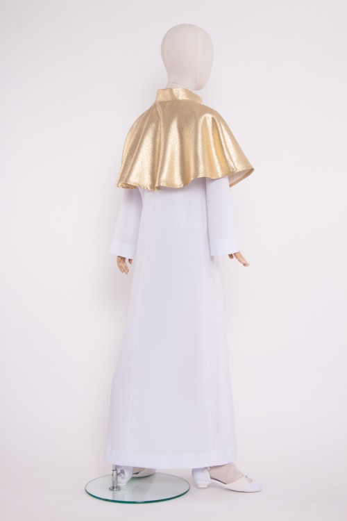 Eine schöne, kurze Pelerine für einen engagierten Chor. Der Stehkragen, der bis zur Hälfte der Schultern reicht, ist in drei Längen erhältlich - 20cm, 30cm und 50cm, wodurch Sie das Gewand an die Körpergröße jedes einzelnen Chormitgliedes anpassen können. Die kurze Pelerine wird aus brokatstoff gefertigt und wird mit Schnüren gebunden.