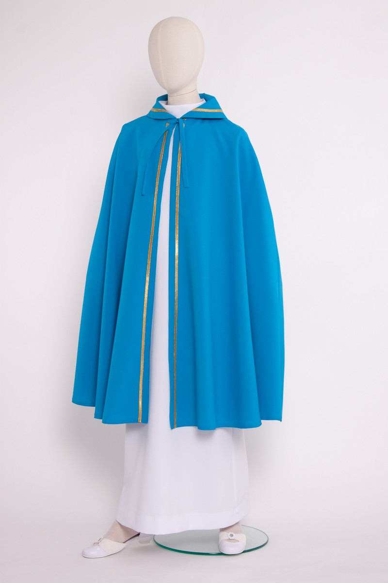 Schicke, farbenfrohe, lange, mit einem Goldband verzierte Pelerine. Eine interessante Pelerine mit einem Zipfelkragen für Ministranten, Lektoren, Chöre oder musikalische Kirchengruppen. Dieses Modell hat einen Zipfelkragen und wird mit Schnüren gebunden. Die Pelerine besteht aus schön anliegendem, knitterarmen Stoff. Erhältlich in verschiedenen Längen von Midi bis Maxi - von 60 bis 130 cm. Hergestellt aus Gabardine (100% Polyester).