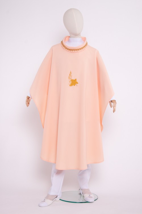 Eine lange Pelerine für Chöre im Kaselstil. Die Pelerine im Kaselstil ist an der Vorderseite mit goldenen Wein- und Spitzenstickereien verziert, hat einen breiten Golfkragen und ist mit einem goldenen Spitzenband überzogen. Aufgrund der unterschiedlichen Größen der Chormitglieder ist es möglich, das Produkt in verschiedenen Längen auszuwählen. Das Gewand besteht aus leichter und schön anliegender Gabardine (100% Polyester).