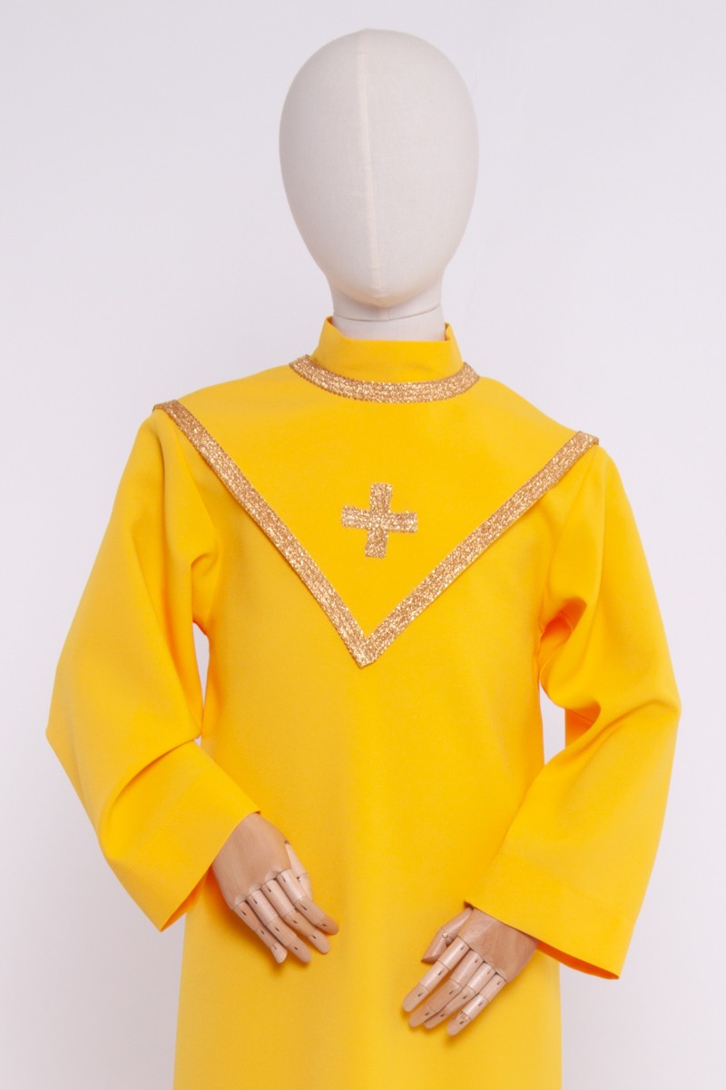 Mitglieder einer Musikgruppe oder eines Kirchenchors brauchen ein Gewand, das sie bei feierlichen Anlässen tragen können und das ihre Musik ästhetisch untermalt. Unsere Produkte wurden mit Rücksicht auf ihre Bedürfnisse entwickelt. Dieses Kleidungsstück besteht aus zwei Teilen - einer leichten und gemütlichen Albe mit langen Ärmeln und einem beeindruckenden Kragen. Das Outfit des Chores T1/zol besteht aus einer gelb Albe und einem Kragen, der mit einem goldenen Band und einem Kreuz verziert ist. Der Stoff, aus dem dieses Set hergestellt wird, zeichnet sich durch seine Leichtigkeit, Luftigkeit und Bequemlichkeit aus.