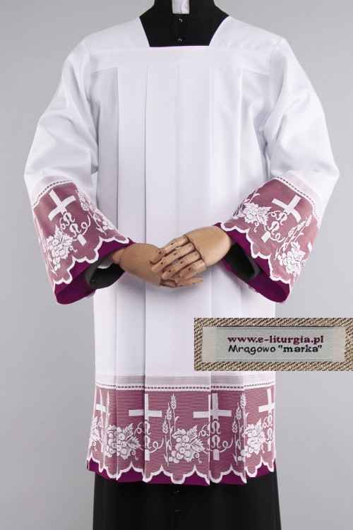 Chorrock mit Spitzendekorationen ist den Prälaten gewidment. Dieses Gewand hat einen klassischen Schnitt und zeichnet sich durch zarte Spitze aus, die mit purpurfarben Stoff unterlegt ist. Die Unterseite und die Ärmel des Kleidungsstücks haben Spitzeneinsätze aus 22cm hohem Polyestergewebe und sind mit purpurfarbenen Stoff unterlegt. Das klassische liturgische Motiv ist sehr beliebt und zugleich elegant. Es ist in zwei Stoffarten erhältlich: Gabardine (Polyester) und Baumwolle mit Viskose.