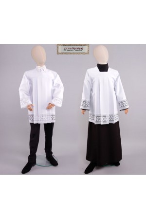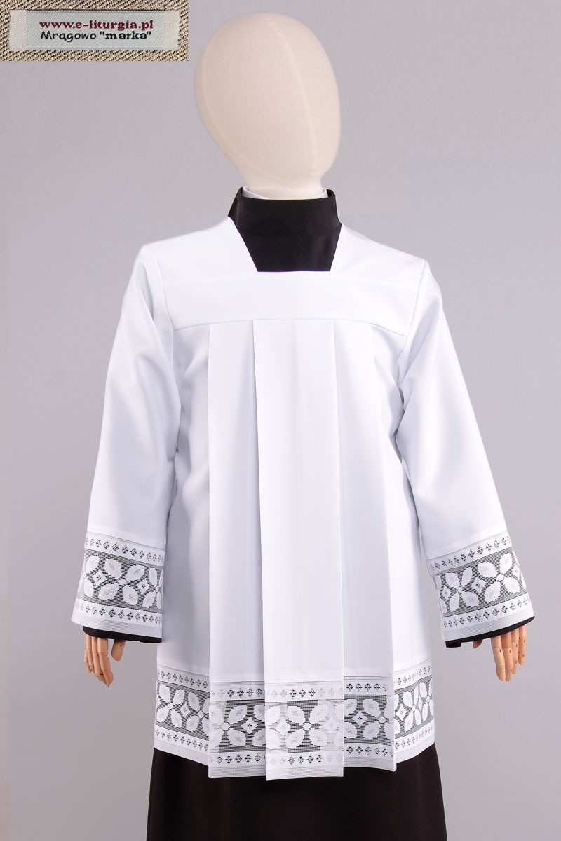 Der Chorrock im römischen Stil mit gepressten Laschen ist die beliebteste und gängigste Tracht für Ministranten. Das Kleidungsstück zeichnet sich durch seine gepressten Laschen aus, die aus dem rechteckigen Dekolleté hervorgehen. Das hochwertige Polyester oder die Baumwolle mit Viskose, aus denen das Kleidungsstück genäht ist, sind leichte, knitterarme Materialien, die schön anliegen. Diejenigen, die am Altar dienen, werden nicht nur gut aussehen, sondern sich auch wohl fühlen. Das Produkt kann in Waschmaschinen gewaschen werden.