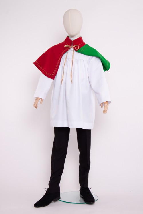 Die doppelseitige Pelerine kann in verschiedenen Situationen während der liturgischen Zeit benutzt werden. Die Pelerine für Ministranten oder Lektoren kann auf beiden Seiten benutzt werden, die jeweils in kontrastierenden Farben erhältlich sind. Sie besteht aus einem Stoff, der perfekt für den alltäglichen Gebrauch geeignet ist: leicht, knitterarm, leicht zu bügeln und schmutzabweisend. Aus Gabardine und Brokatstoff (100% Polyester). Bei der Wahl der Größe/Länge sollte die Gesamthöhe berücksichtigt werden.