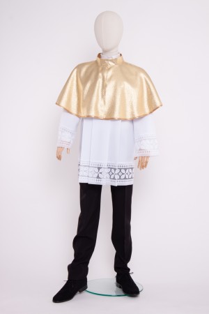 Ein außergewöhnlich subtiler und charmanter gold Kurzmantel für Ministranten. Kurze Ministrantenpelerine mit Goldbanddekoration. Bei dem vorgestellten Modell handelt es sich um einen kürzeren Kragen für Ministranten, der sich durch einen Stehkragen und einen Schnitt an der Vorderseite auszeichnet. Das Kleidungsstück wird mit einem Druckknopf verschlossen. Unsere Pelerinen sind aus leichtem und luftigem Stoff (Gabardine - Polyester), was für Komfort während des Gottesdienstes am Altar sorgt.