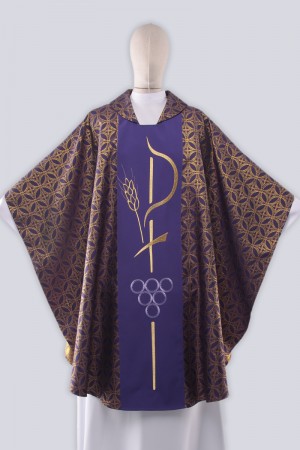 Wunderschönes gold-violette Messgewand mit einem gestickten liturgischen Symbol. Die Farbe des Messgewandes passt wunderbar zu den Stickereien auf der Vorder- und Rückseite. Das Messgewand in ist ideal für den priesterlichen Dienst während der Messe oder anderer kirchlicher Zeremonien.
