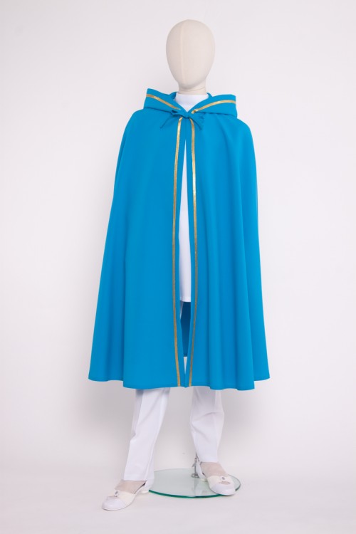 Die Pelerine ist mit einem zarten goldenen Band am Saum verziert. Die Pelerine kommt in Midi- oder Maxi-Länge. Dieser Schnitt hat einen höheren Kragen. Das vorgestellte Modell wird mit Schnüren festgemacht. Um den Bedürfnissen unserer Kunden gerecht zu werden, bieten wir das Gewand in vielen Längen an, so dass es jeder Person passen wird.